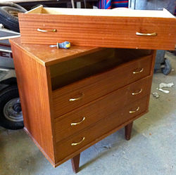 ![]() ©Elodie TERRIEN - Commode - Photo de la découpe du meuble. | ![]() ©Elodie TERRIEN - Commode - Photo du meuble retaillé. | ![]() ©Elodie TERRIEN - Commode - Photo des pieds du meuble avant découpe. |